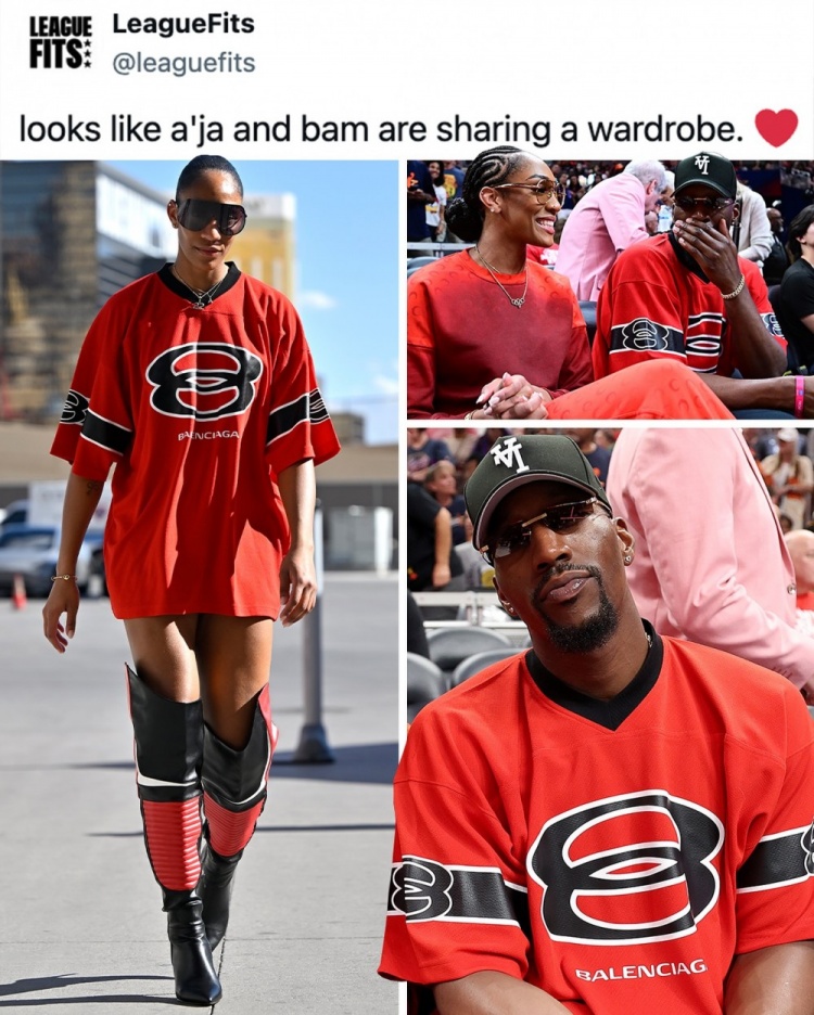 9月9日,潮流平台Leaguefits分享了WNBA球星阿贾-威尔逊的最新街拍造型,她身穿的球衣风格上衣此前也曾被NBA球员阿德巴约穿着亮相。Leaguefits配文调侃道:"共享衣橱的情侣注定会长久。"