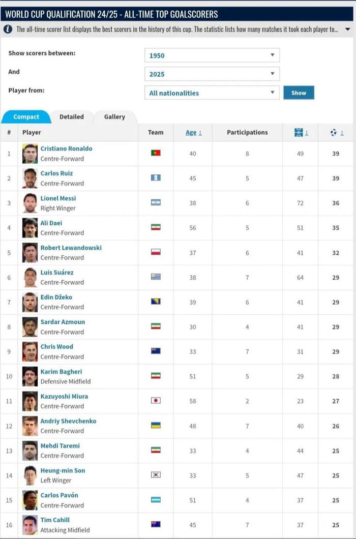 在全球世预赛历史射手榜上,进球数前5的球员如下: