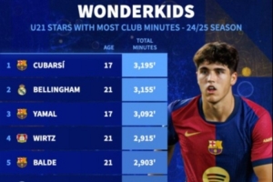 体育资讯3月26日讯 根据德转统计,库巴西是本赛季出场时间最多的U21球员,达到3195分钟,贝林厄姆、亚马尔分居二三位。