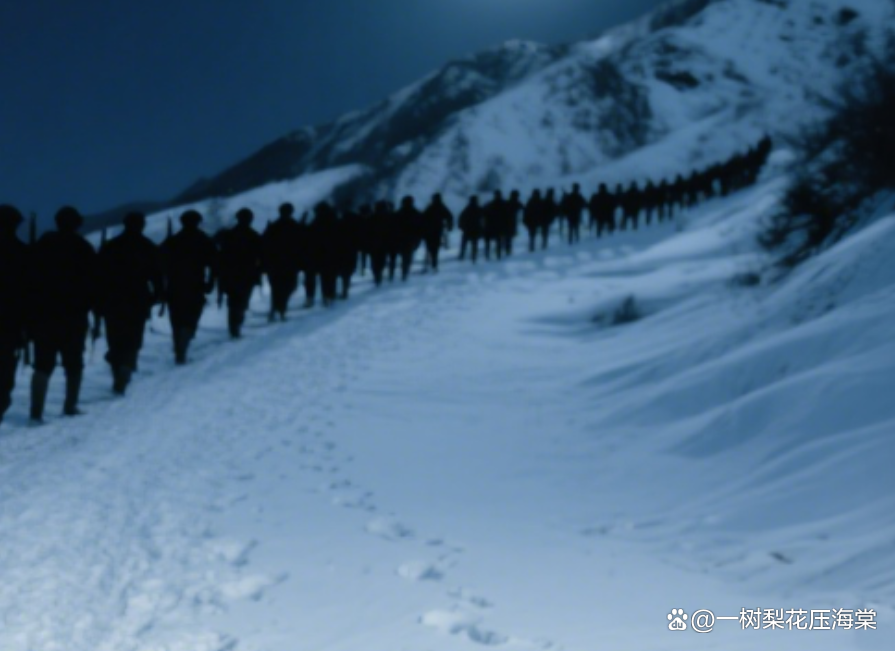 山路崎岖难行,积雪很深,战士们背着沉重的装备,行进速度很慢。